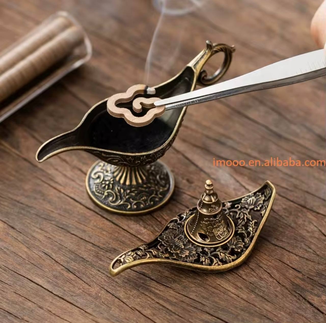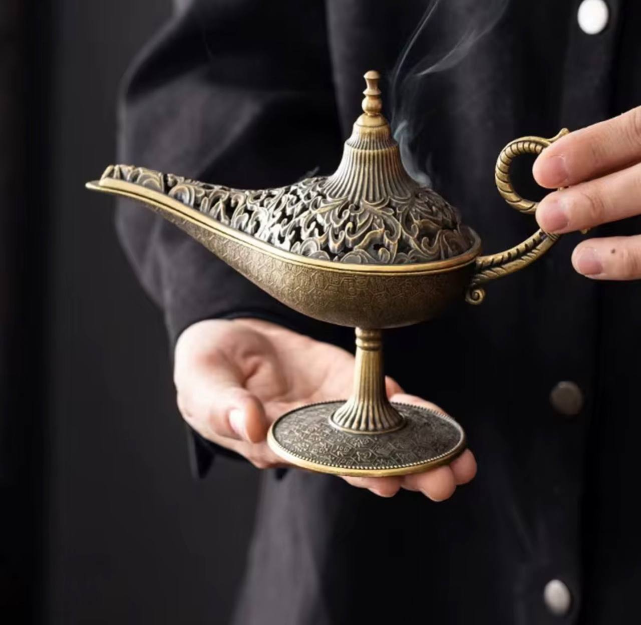 این جاعودی فانتزی با الهام از چراغ علاءالدین، از جنس فلز با روکش آنتیک برنجی ساخته شده و با نقش و نگارهای ظریف حکاکی شده است. طراحی دستهدار و دهانه کشیده آن نه تنها زیبایی دکوراتیو به فضا میبخشد، بلکه بهعنوان پایهای امن برای سوزاندن عود مخروطی یا نگهداری ذغال و عطریات به کار میآید. این ست معمولاً شامل درپوش مشبک (برای کنترل دود و شعله) و پنس کوچک برای جابهجایی عود یا ذغال است. مناسب برای استفاده در سالن نشیمن، اتاقخواب، فروشگاههای دکوری و بهعنوان هدیه شیک.