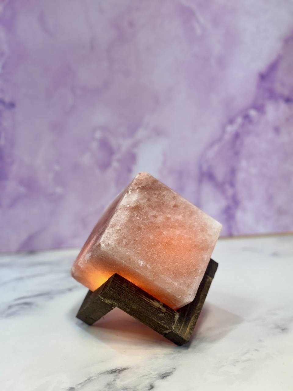 آباژور سنگ نمک طرح مکعب پایه چوبی