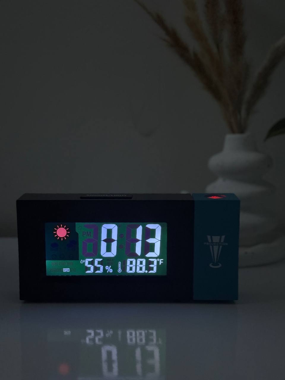 ساعت دارای زنگ هشدار، نمایش ایام هفته، نمایش تاریخ، مقدار رطوبت، دما، نمایش ساعت بر روی دیوار به وسیله پروژکتور و … می باشد.